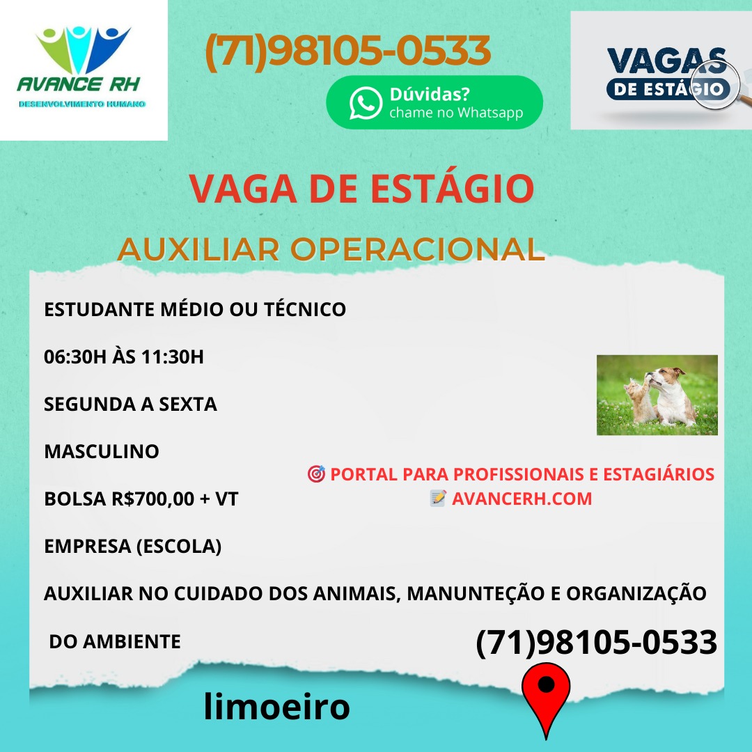 A consultoria **Avance RH Desenvolvimento Humano** anuncia uma excelente oportunidade de Estágio para atuar como **Auxiliar Operacional** na região de **Limoeiro**. A vaga é ideal para jovens que buscam experiência prática em um ambiente dinâmico, como uma instituição de ensino (escola), e que têm afinidade com o cuidado de animais e organização de espaços. Este estágio é a porta de entrada para quem deseja desenvolver responsabilidade, proatividade e habilidades de manutenção básica.