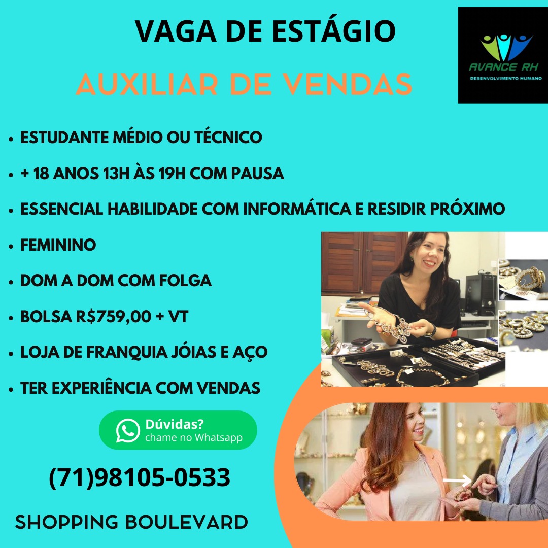 A consultoria Avance RH Desenvolvimento Humano está com uma excelente oportunidade de estágio para o cargo de Auxiliar de Vendas, que será alocado em uma Loja de Franquia especializada em Joias e Aço, localizada no prestigiado Shopping Boulevard em Feira de Santana, Bahia. Esta é uma chance perfeita para estudantes que buscam aplicar seus conhecimentos, ganhar experiência prática no varejo de luxo/semi-joias e iniciar sua trajetória profissional em um ambiente movimentado e de aprendizado contínuo.