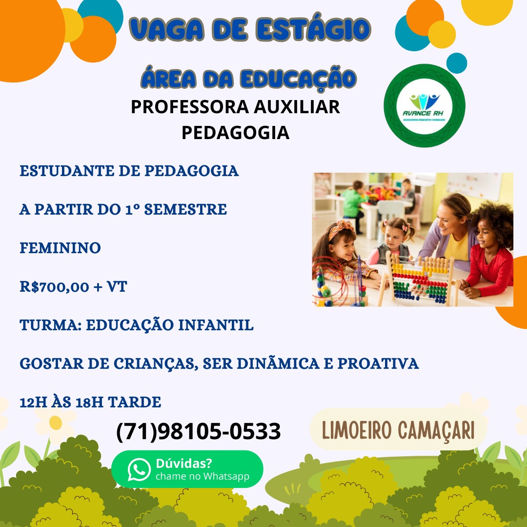 Ao enviar a mensagem, mencione a vaga de Estágio Pedagogia – Limoeiro, Camaçari. Prepare seu currículo destacando o semestre atual do curso de Pedagogia e qualquer experiência relevante em trabalho com crianças ou monitoria. Esta pode ser a chance que faltava para impulsionar sua carreira na Educação!