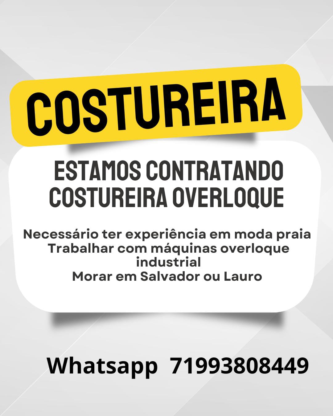 Se você é uma profissional dedicada, com experiência em costura industrial e deseja fazer parte de uma equipe que valoriza o talento e a qualidade, essa é a sua oportunidade! Estamos com vaga aberta para Costureira Overloque em Salvador e Lauro de Freitas, com foco na produção de peças de moda praia.