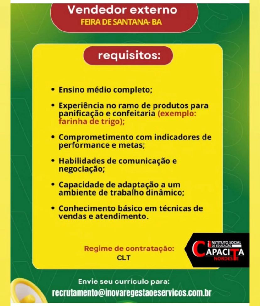 Palavras-chave SEO: vaga vendedor externo Feira de Santana, emprego vendas Bahia, oportunidade vendedor panificação, vagas comerciais Feira de Santana, Instituto Capacita Nordeste.